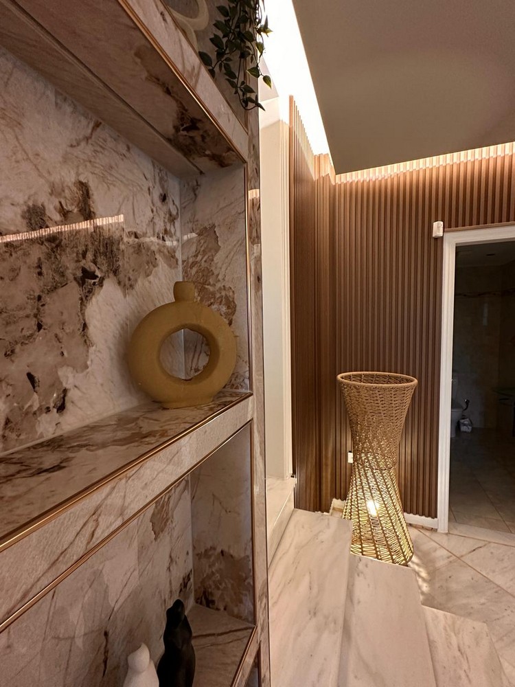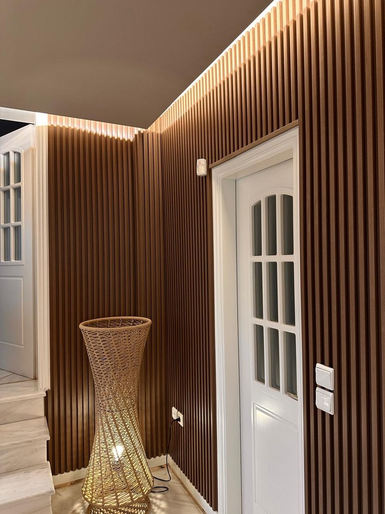 Οι γύρω τοίχοι έχουν επενδυθεί με WPC 3D πάνελ σε σκούρα καφέ ξύλινη απόχρωση (EID0000026), τα οποία προσθέτουν βάθος, υφή και ένα δυναμικό παιχνίδι φωτός και σκιάς, ενώ συνδυάζονται αρμονικά με τους μαρμάρινους τόνους.