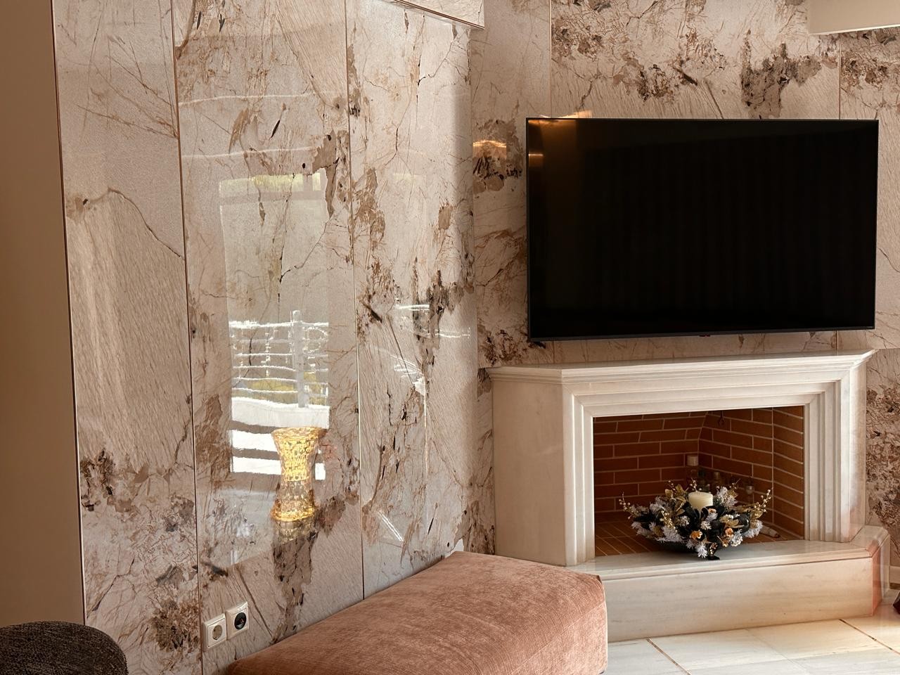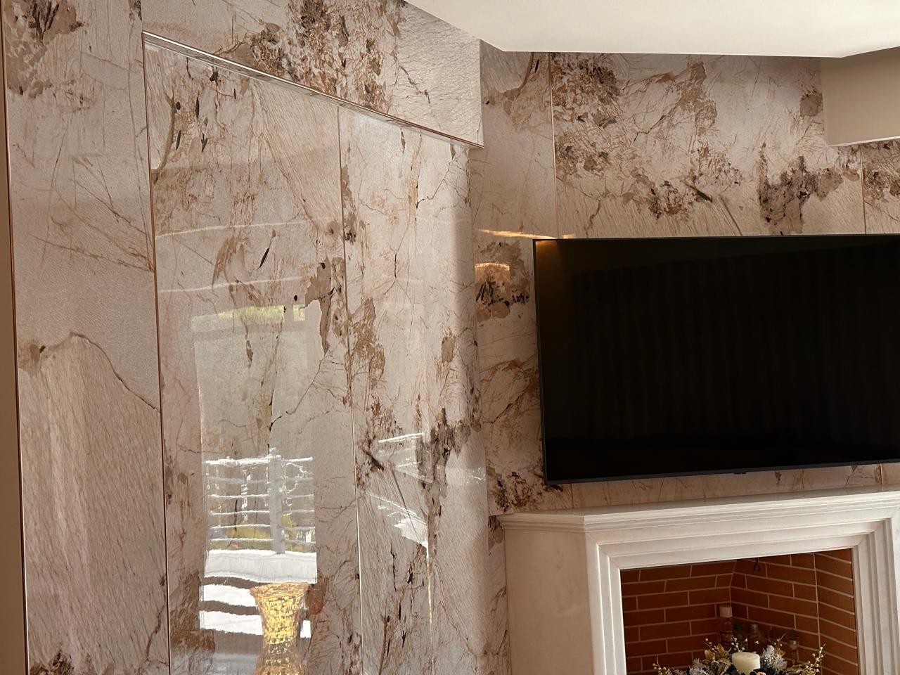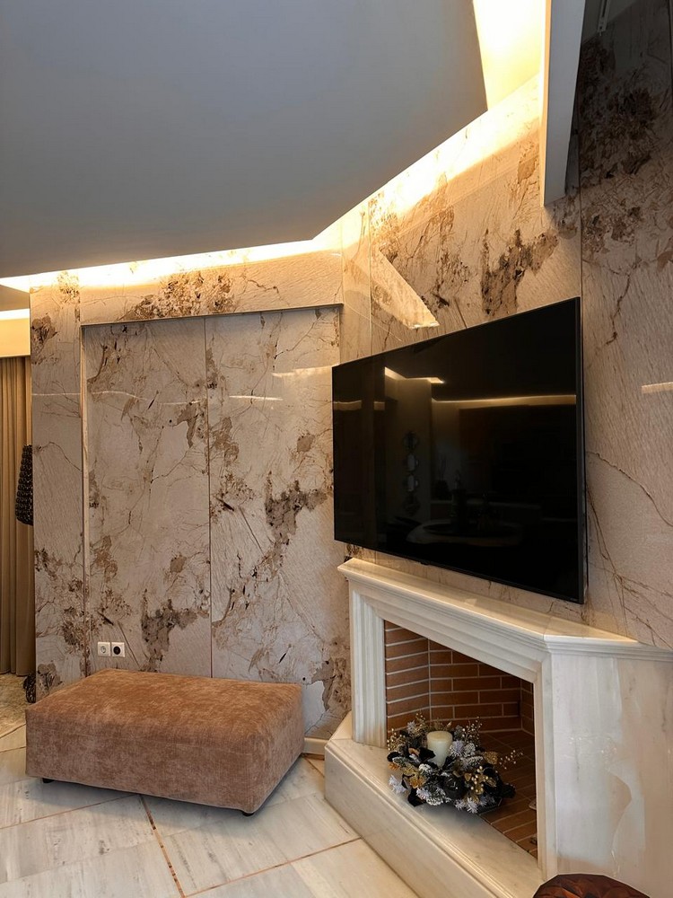 Το τζάκι και η ραφιέρα έχουν επενδυθεί με PVC πάνελ μαρμάρου σε ανοιχτό καφέ χρώμα (EID0000018) – Light Golden Emperador, προσφέροντας μια λεία και διαχρονική επιφάνεια που συνδυάζει ανθεκτικότητα με την πολυτελή αίσθηση του φυσικού μαρμάρου Emperador. Για την επίτευξη άψογου αποτελέσματος, η εγκατάσταση ολοκληρώθηκε με μπρονζέ μεταλλικά προφίλ στις άκρες και στις γωνιακές ενώσεις, χαρίζοντας ακρίβεια και κομψότητα στο τελικό φινίρισμα.