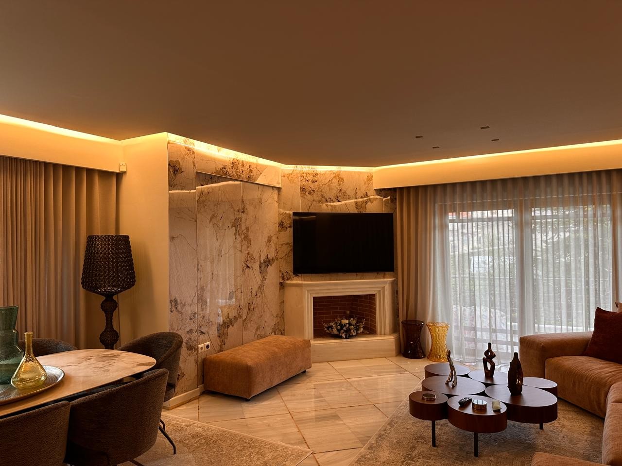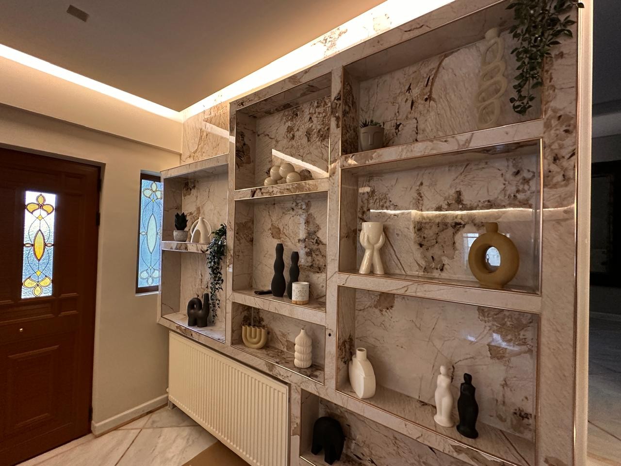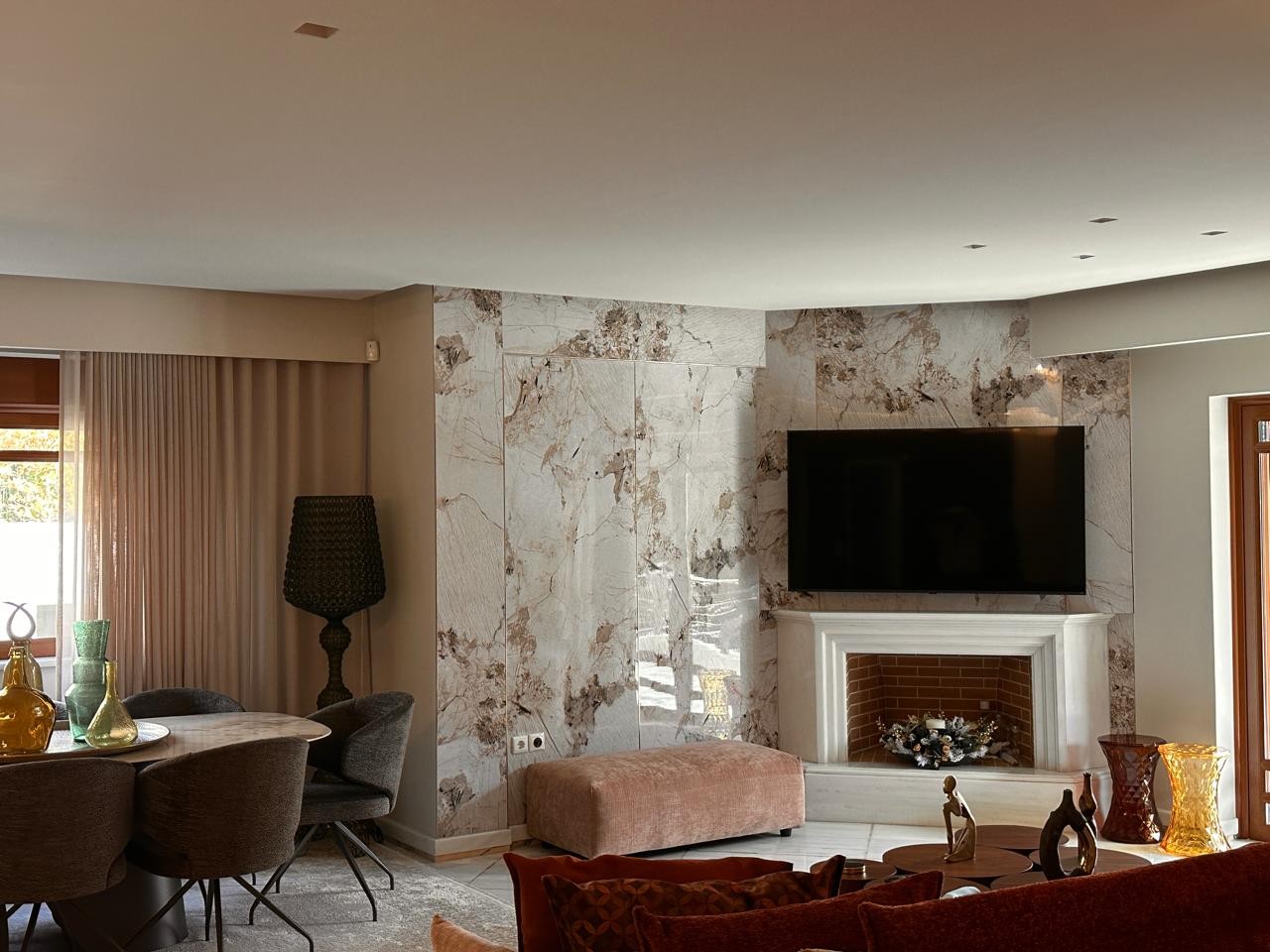 Το τζάκι και η ραφιέρα έχουν επενδυθεί με PVC πάνελ μαρμάρου σε ανοιχτό καφέ χρώμα (EID0000018) – Light Golden Emperador, προσφέροντας μια λεία και διαχρονική επιφάνεια που συνδυάζει ανθεκτικότητα με την πολυτελή αίσθηση του φυσικού μαρμάρου Emperador. Για την επίτευξη άψογου αποτελέσματος, η εγκατάσταση ολοκληρώθηκε με μπρονζέ μεταλλικά προφίλ στις άκρες και στις γωνιακές ενώσεις, χαρίζοντας ακρίβεια και κομψότητα στο τελικό φινίρισμα.