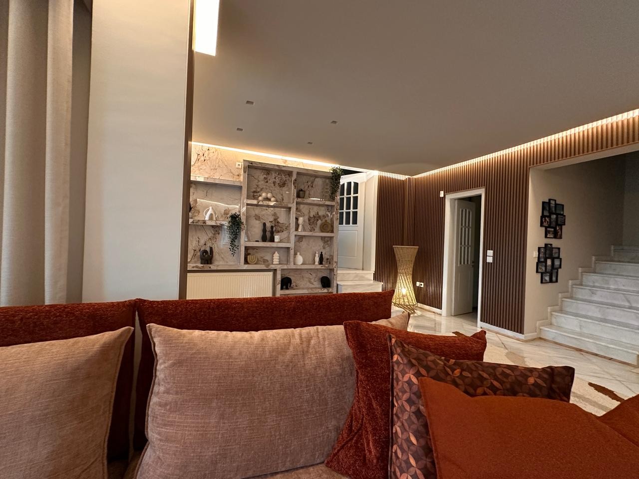Ο συνδυασμός των PVC πάνελ Light Golden Emperador, των WPC 3D πάνελ σε σκούρο καφέ και των μπρονζέ μεταλλικών προφίλ δημιουργεί μια ενιαία και ισορροπημένη αισθητική, που συνδυάζει μοντέρνα κομψότητα με φυσική ζεστασιά. Η ραφιέρα εισόδου προσφέρει πρακτικούς χώρους αποθήκευσης και προβολής, ενώ το ανοιχτό τζάκι λειτουργεί ως λειτουργικό και εντυπωσιακό κεντρικό στοιχείο, αναβαθμίζοντας την ατμόσφαιρα του καθιστικού.